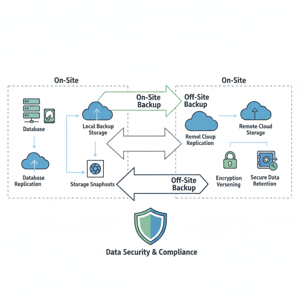Definition: Protect critical business data with real-time replication and secure backup strategies, both on-site and off-site, ensuring fast recovery when needed.
