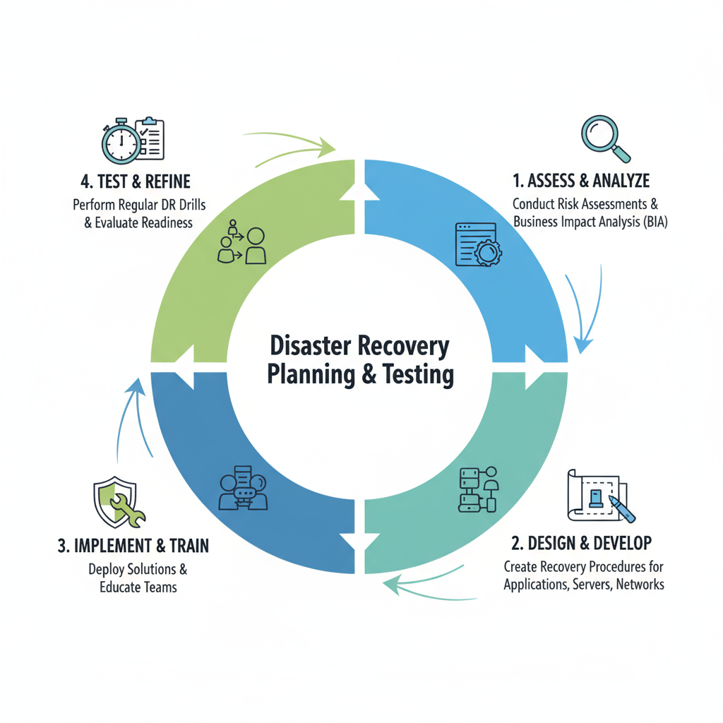 Testing & Validation – Conduct DR drills, failover testing, and system audits