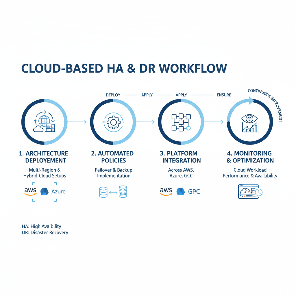 Definition: Utilize cloud platforms like AWS, Azure, and GCP to implement scalable, resilient, and flexible high availability and disaster recovery architectures.
