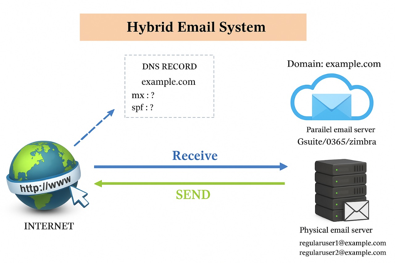 Hybrid Email Hosting is a split-domain solution that allows you to run two or more email platforms under the same domain.
